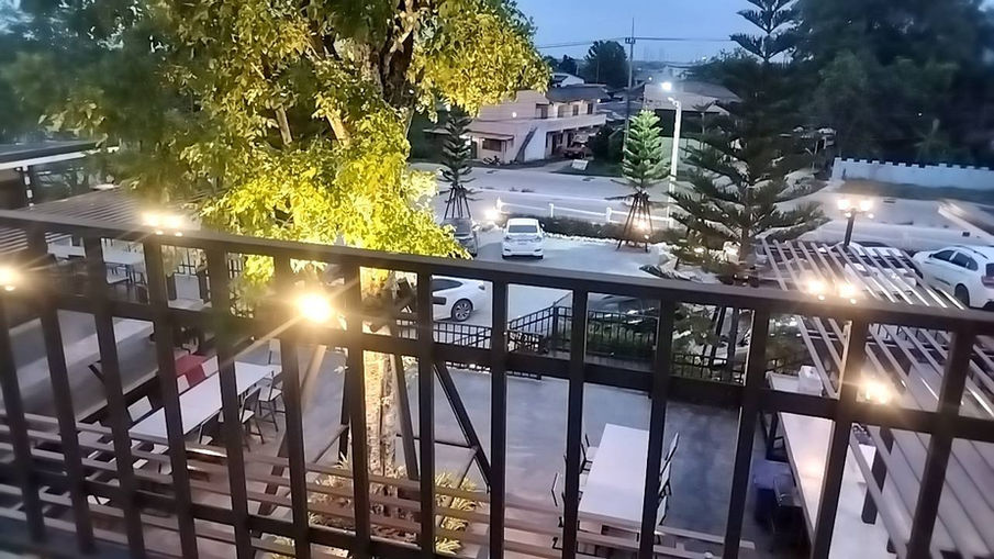 ร้านอาหารวิวสนามไดร์ฟ ท้องฟ้า ภูเขา หญ้าสีเขียว เสริฟพร้อมอาหารร้อนๆ ตกแต่งด้วยไฟประดับล้อมรอบโต๊ะทานอาหาร